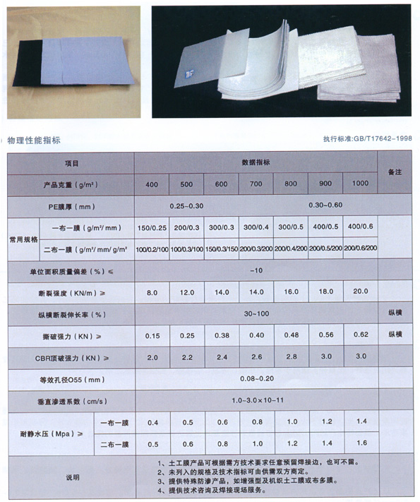 復合土工膜是由土工布為基材、高分子材料等(如PE膜、EVA等)為膜材兩種以上的材料復合而成的土工合成材料。它以土工織物為導水層,以高分子材料為防滲層,經(jīng)壓延、熱溶涂敷而成,該生產(chǎn)工藝既保持了土工基布的良好力學性能,又使復合產(chǎn)品薄膜厚度均勻,剝離強度高,避免了薄膜上氣孔、砂眼的形成,大大的提高了膜的抗?jié)B強度,薄膜表面采用壓花處理,增加了成膜的摩擦系數(shù),既提高了防滲工程的穩(wěn)定性,又方便了施工。該產(chǎn)品幅寬3-6.0米。